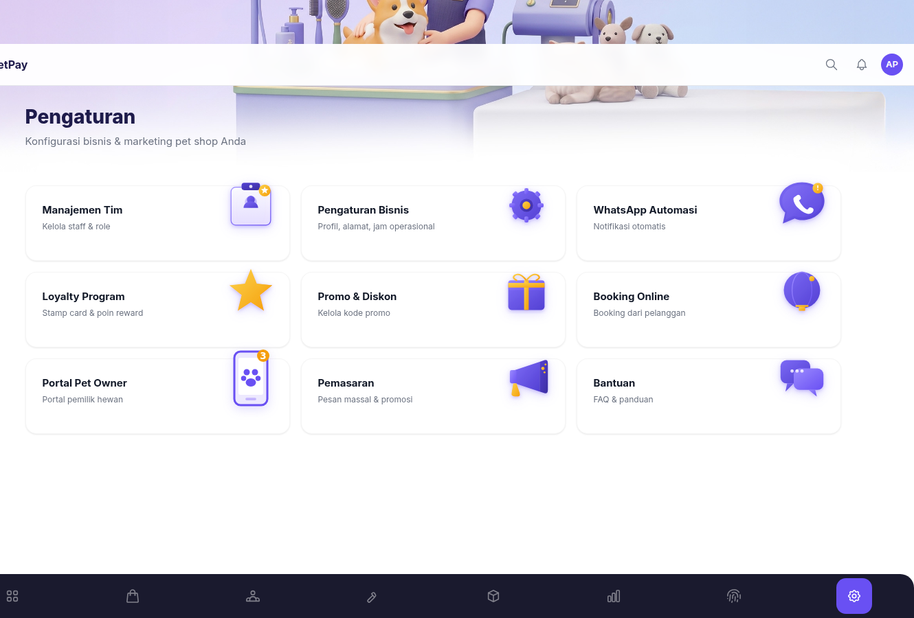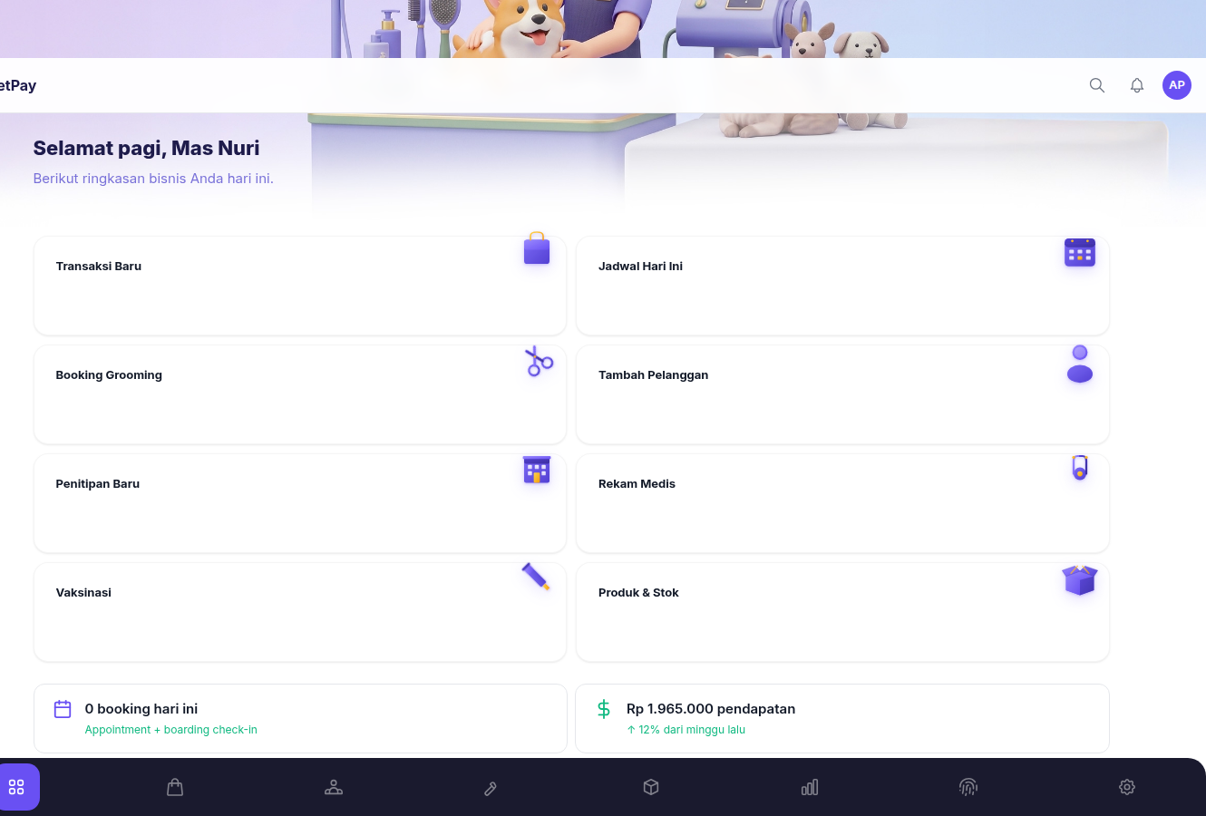 Kelola grooming, penitipan, klinik, kasir, stok, keuangan, dan WhatsApp automasi — semua dalam satu platform.