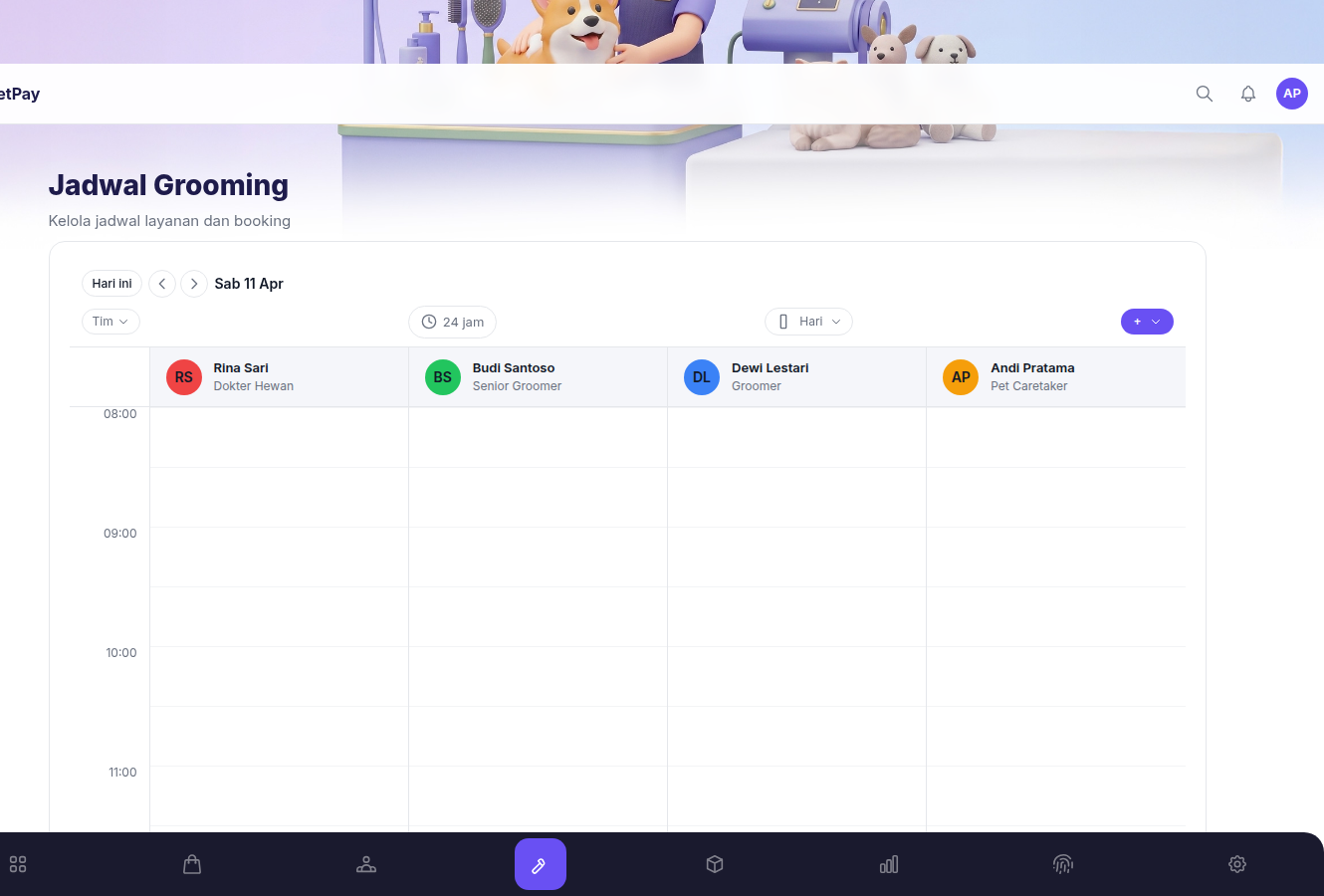 Jadwal grooming per staff, manajemen kandang, rekam medis & vaksinasi. Semua terkoneksi — dari booking sampai pembayaran.